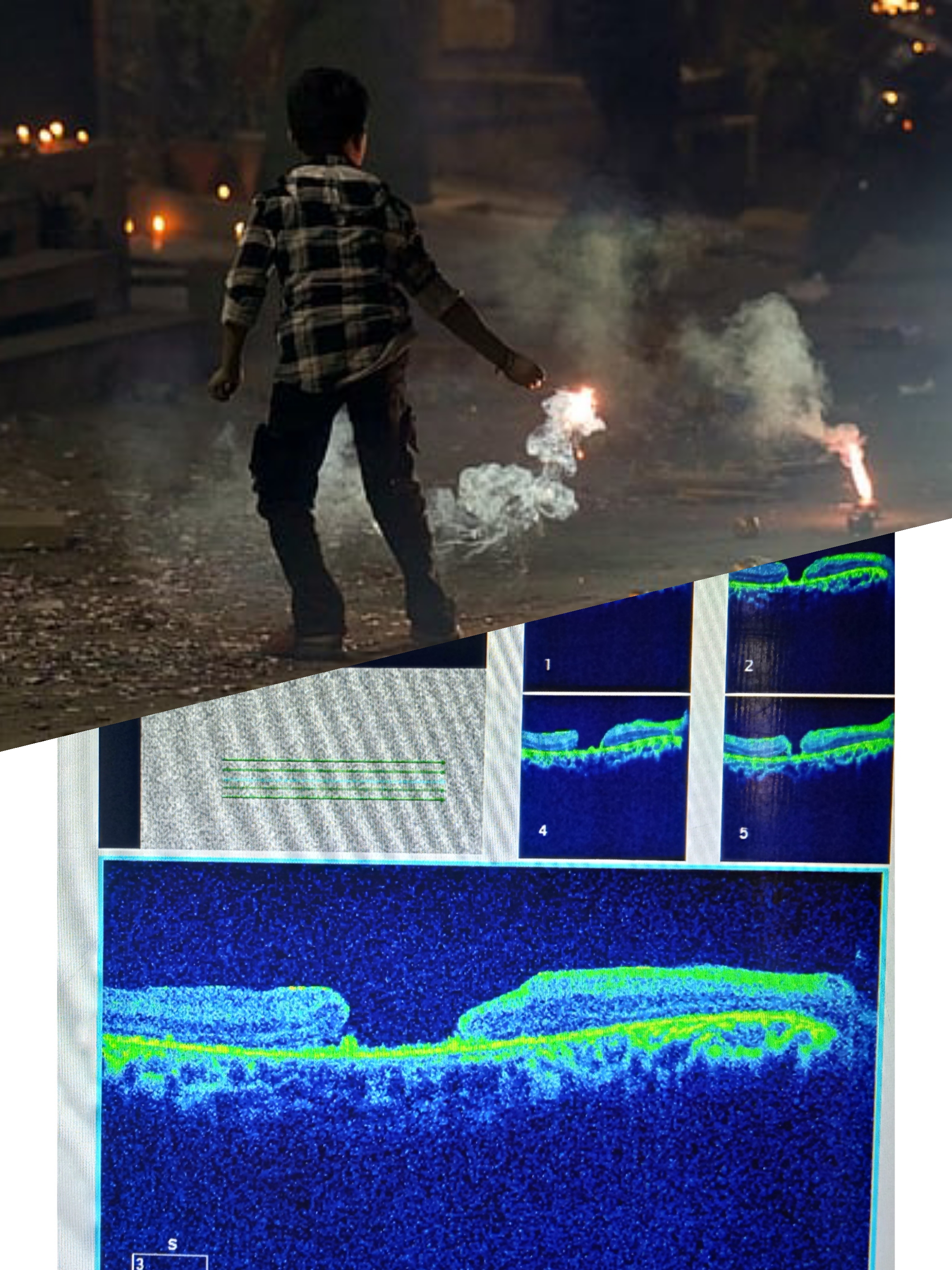 प्राथमिक जांच में मोतियाबिंद पाया गया साथ ही कार्निया भी क्षतिगृस्त हुआ जिनका समय रहते आपरेशन किया गया ,लेकिन नजर में ज्यादा परिवर्तन नहीं आया ,अन्य जांच OCT किया गया जिस जांच मे देखा गया की पर्दे में छेद हो चुका है।